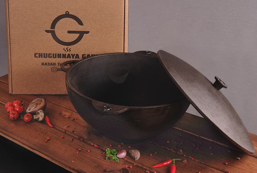 Казан с плоским дном Chugunnaya Gans позволяет готовить любимые блюда на любом виде кухонных плит: от газовых до индукционных. Посуда полностью готова к использованию и не требует очищения от технических масел.