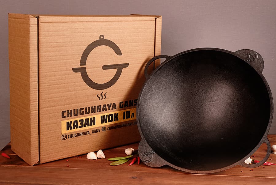 Экологичная премиальная чугунная посуда для приготовления самых разнообразных блюд, преимущественно китайской кухни. Особая форма позволяет осуществить детальную обжарку морепродуктов, мяса, овощей – это создает тонкий вкус и сохраняет сочность продуктов. Подходит для всех видов плит и огня. Chugunnaya Gans – компания с собственным производством в России. Отличается тем, что каждая сковорода и казан проходит ручную обработку, зачистку, шлифовку, воронение. Антипригарного покрытие. Толстые стенки казана выполнены из чистого высококачественного чугуна без примесей.