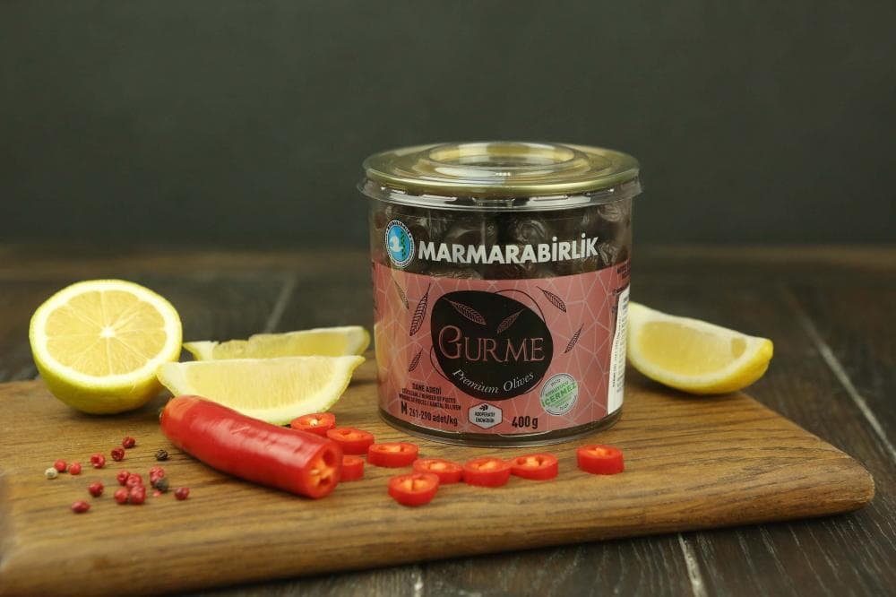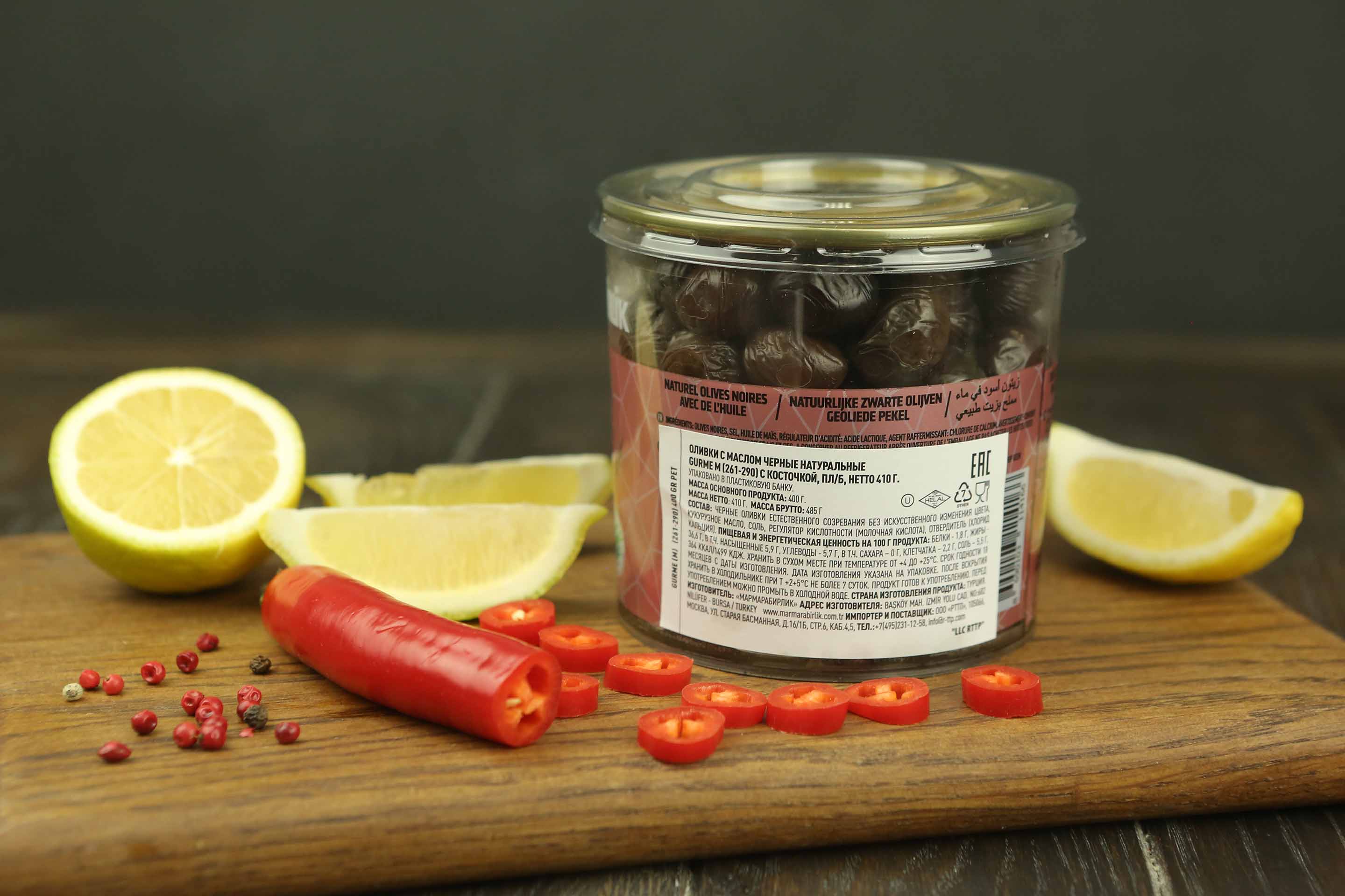 черные оливки естественного созревания без искусственного изменения цвета, кукурузное масло, соль, регулятор кислотности (молочная кислота), отвердитель (хлорид кальция)