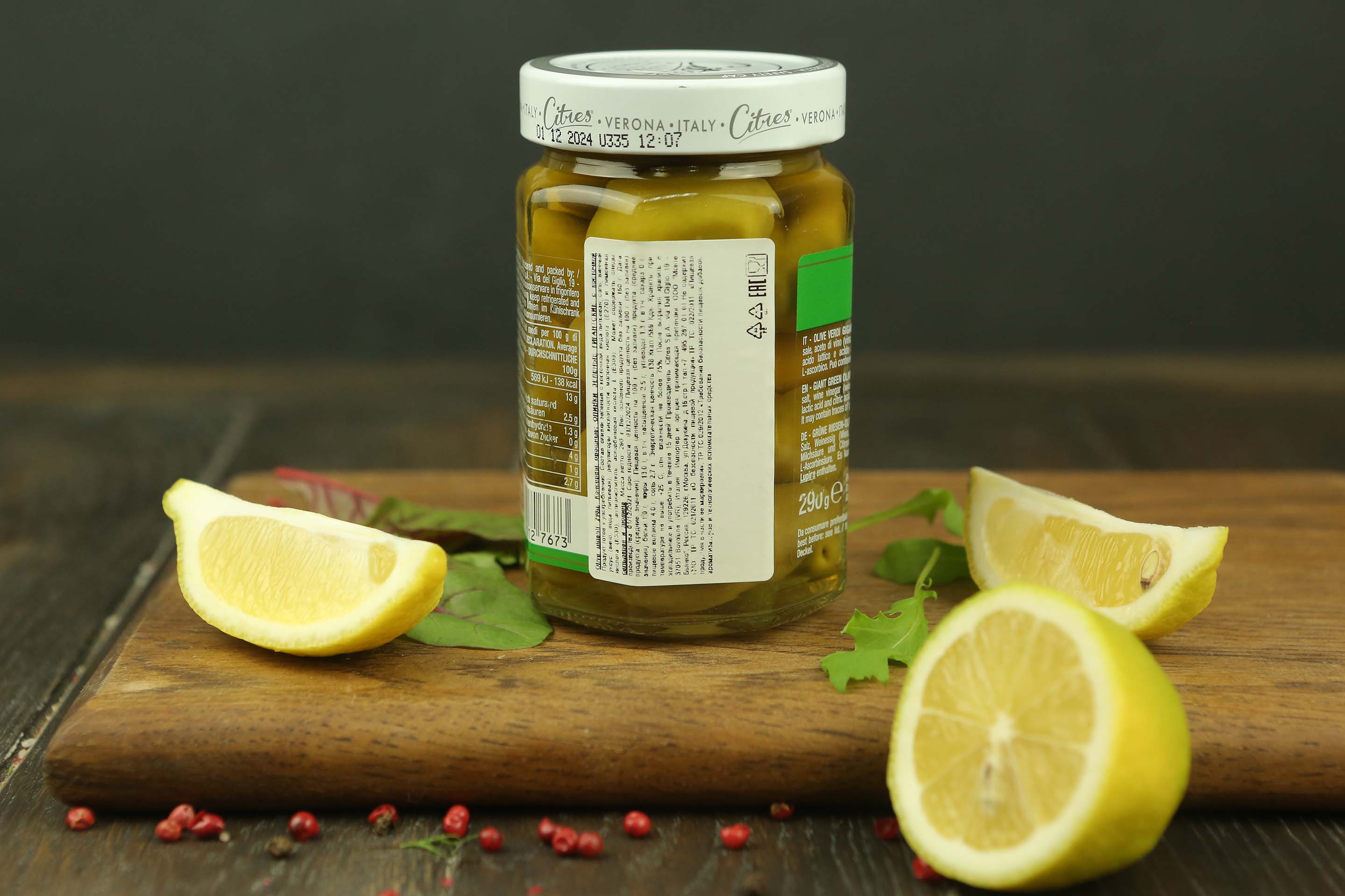 оливки зеленые с косточкой, вода питьевая, соль, винный уксус (вино, вода питьевая), регуляторы кислотности молочная и лимонная кислота, антиокислитель аскорбиновая кислота