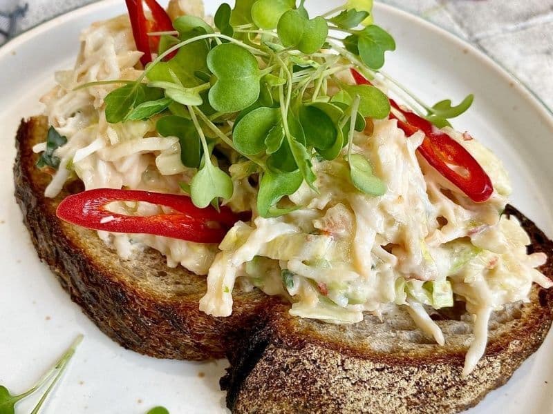 Краб с овощами заправьте соусом, выложите на подсушенный хлеб, украсьте Чили перцем и сразу же подавайте к столу.