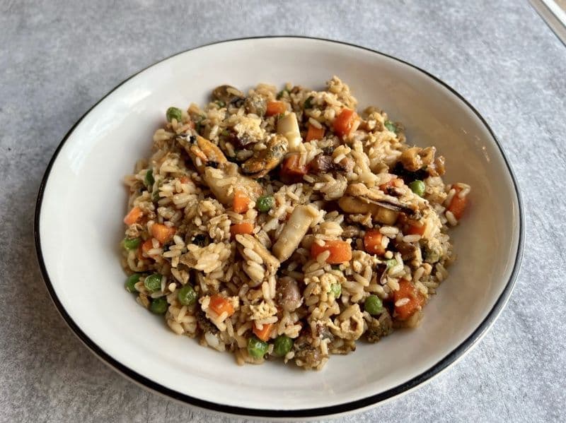 В сковороде, на оливковом масле, обжарьте лук с чесноком и имбирём на среднем огне до лёгкого золотистого цвета. Добавьте в сковороду морской коктейль и включите сильный огонь. Сразу же добавьте бобы, том-ям пасту и карри. Готовьте примерно 2 минуты. Посолите, добавьте помидоры и влейте молоко. Далее добавьте в сковороду рис и все хорошо перемешайте. В самый последний момент добавьте в блюдо зелень.