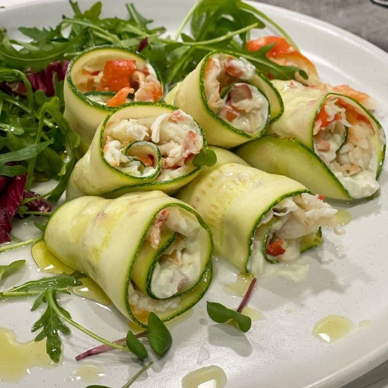 Достаньте из воды цукини, намажьте сыр тонким слоем на цукини, сверху выложите крабовое мясо и аккуратно заверните в рулетик.