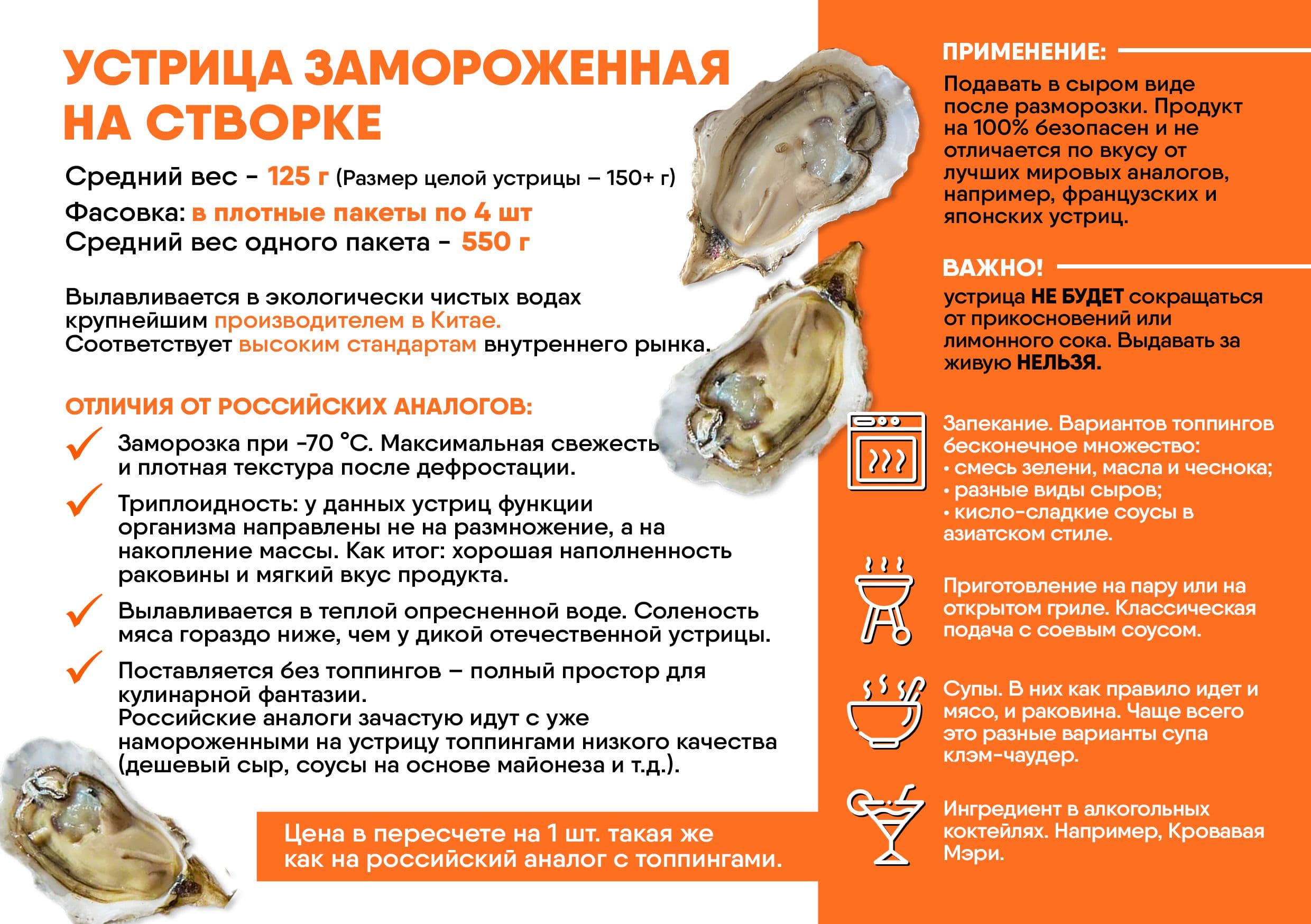 Устрицы — настоящий деликатес. Они крупные и, благодаря тому, что раковина обладает тонкими стенками, в ней много мяса с ярко выраженным вкусом, от слабосолёного до сладковатого.Комплименты на семейном ужине и дружеской вечеринке получить крайне легко, если приготовить свежемороженые устрицы. Правильно размораживаете (на нижней полке холодильника), сбрызгиваете лимоном и подаете в качестве основного блюда или закуски. Нежное солоноватое и слегка сладковатое мясо – такие крупные устрицы бесподобны и для запекания. Рецепт снова легкий: у размороженных устриц чуть-чуть подрезаете мускул (удобнее будет есть), выкладываете раковины на крупную морскую соль, добавляете перец и тонкими слайсами – сыр бри, пармезан или другой любимый. Отправляете в разогретую духовку и уже через 5-7 минут деликатес готов.